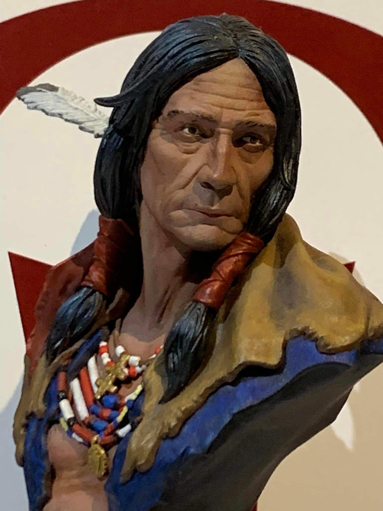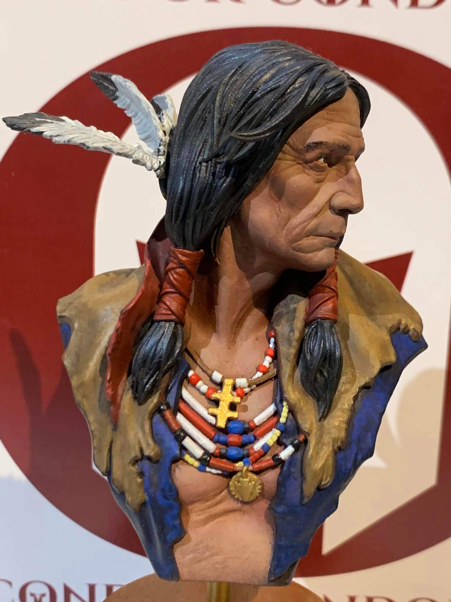 Busto detallado de un guerrero apache, una representación fiel de la cultura y el espíritu de los nativos americanos, ideal para coleccionistas de figuras históricas.