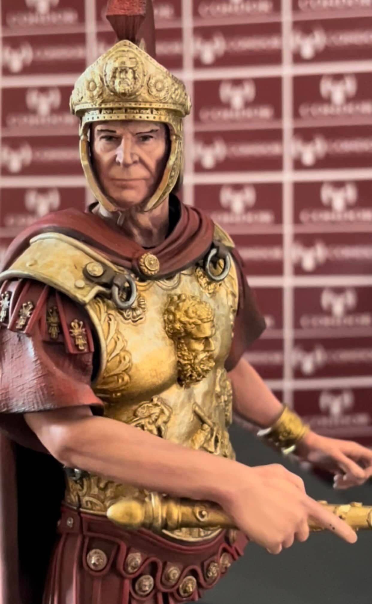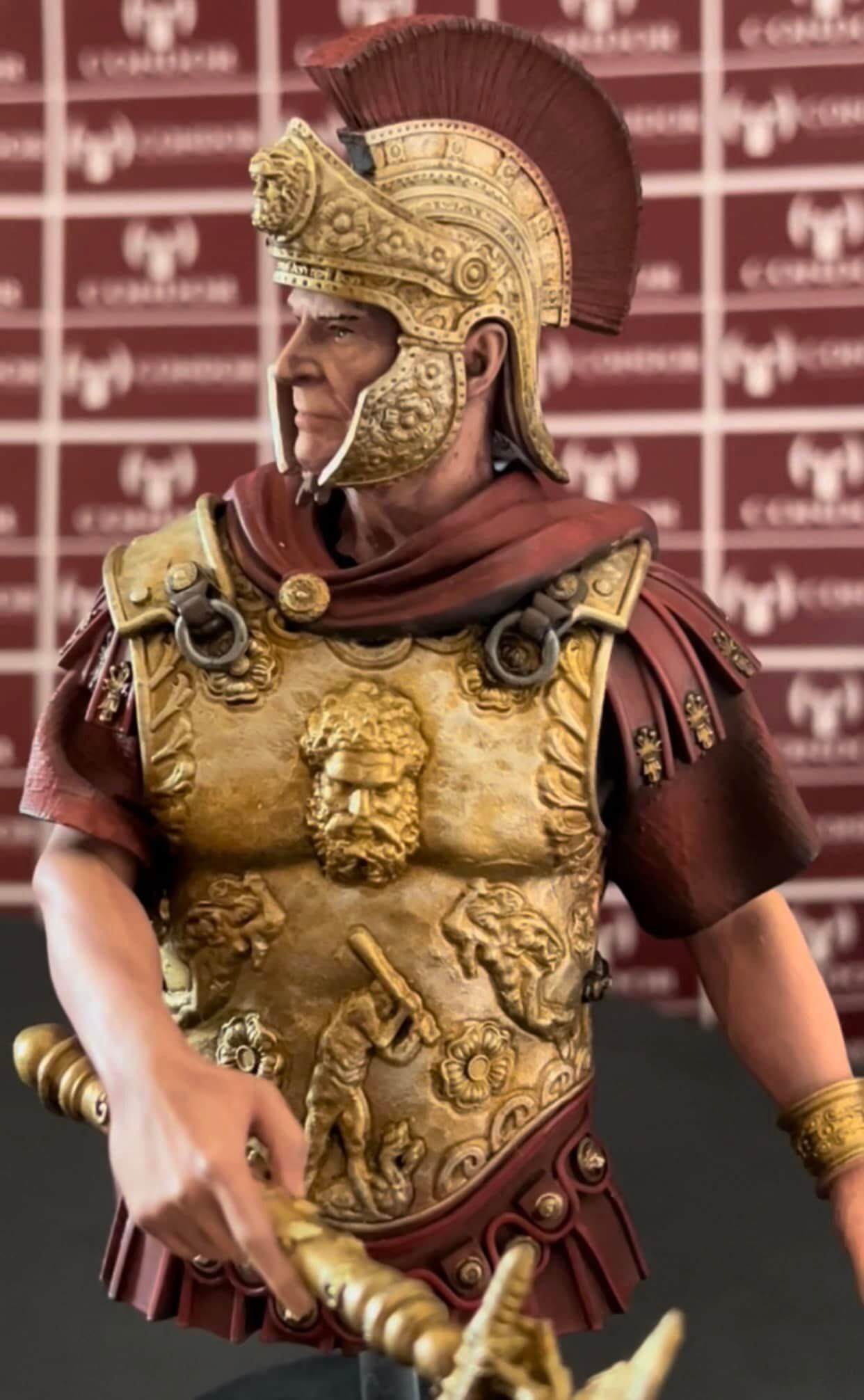 Busto detallado de un general romano, una representación histórica que destaca el poder y la estrategia militar de la antigua Roma, ideal para coleccionistas de figuras históricas.